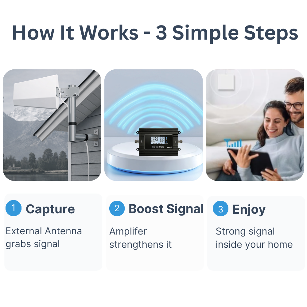 In general, the booster catches the signals from the nearest cell tower in the area by the external antenna which is included in the kit, then it sends the signal to the booster box. The box amplifies the signals, ensuring reliable coverage even in areas with poor signal strength, and the internal antenna spreads the signals inside the closed area.